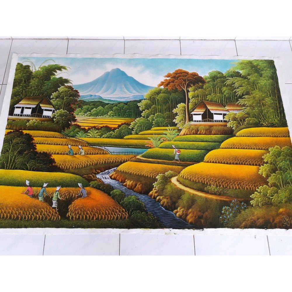 Lukisan dengan pemandangan sawah dimana di lukisan itu sang petani sedang menanam padi.